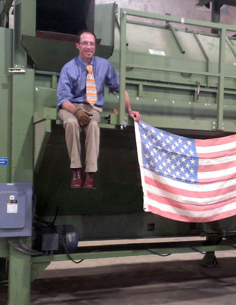 Mr. Hemp sitting on part of a hemp decortication line that he was key in the acquisition of in North Carolina, where he is proudly holding a hemp fiber flag of the United States of America.